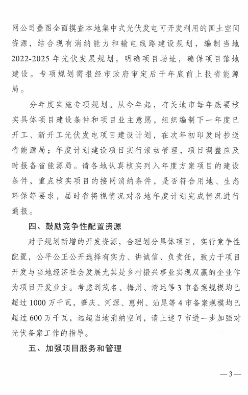 4.鼓勵(lì)競(jìng)爭(zhēng)性配置資源:考慮到茂名、梅州、清遠(yuǎn)等3市備案規(guī)模均已超過(guò)1000萬(wàn)千瓦,肇慶、河源、惠州、汕尾等4市備案規(guī)模均已超過(guò)600萬(wàn)千瓦,遠(yuǎn)超當(dāng)?shù)叵{空間,請(qǐng)上述7市進(jìn)一步加強(qiáng)對(duì)光伏備案工作的指導(dǎo)。