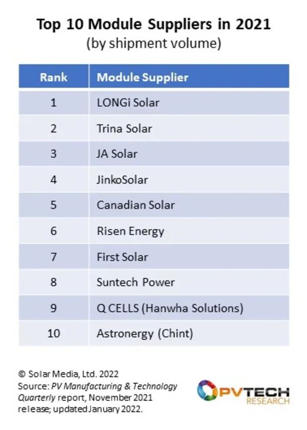 美通社消息——在PV-Tech發(fā)布的《2021年全球組件供應商top10》排名中,前十名中國企業(yè)占7席,隆基、天合光能、晶澳太陽能、晶科能源依次位居2021年組件出貨量全球排名前四。