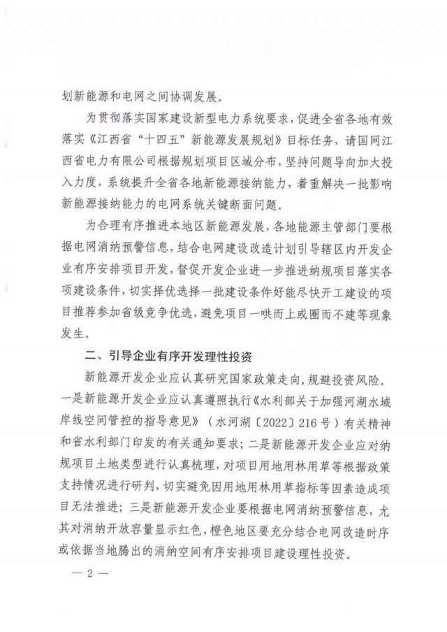 文件強調(diào),新能源開發(fā)企業(yè)應(yīng)認(rèn)真遵照執(zhí)行《水利部關(guān)于加強河湖水域岸線空間管控的指導(dǎo)意見》(水河湖〔2022〕216號)有關(guān)精神和省水利部門印發(fā)的有關(guān)通知要求;二是新能源開發(fā)企業(yè)應(yīng)對納規(guī)項目土地類型進(jìn)行認(rèn)真梳理,對項目用地用林用草等根據(jù)政策支持情況進(jìn)行研判,切實避免因用地用林用草指標(biāo)等因素造成項目無法推進(jìn);三是新能源開發(fā)企業(yè)要根據(jù)電網(wǎng)消納預(yù)警信息,尤其對消納開放容量顯示紅色、橙色地區(qū)要充分結(jié)合電網(wǎng)改造時序或依據(jù)當(dāng)?shù)仳v出的消納空間有序安排項目建設(shè)理性投資。