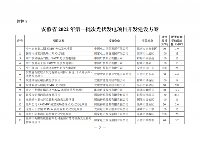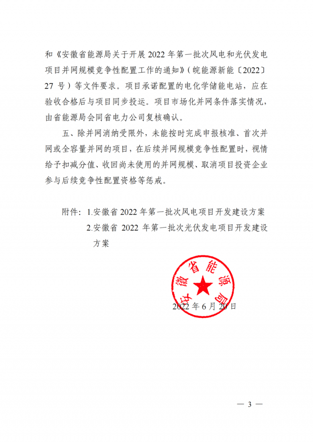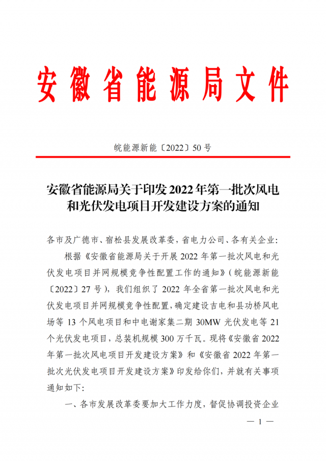 6月20日,安徽省能源局正式下發(fā)了《關于2022年第一批次風電和光伏發(fā)電項目開發(fā)建設方案》的通知。根據(jù)該通知,安徽省2022年全省第一批次風電和光伏發(fā)電項目并網(wǎng)規(guī)模競爭性配置,確定建設21個光伏發(fā)電項目和13個風電項目,總裝機規(guī)模300萬千瓦,其中光伏200萬千瓦、風電100萬千瓦。