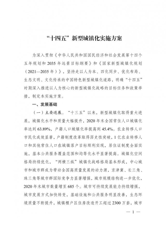 國(guó)家發(fā)展改革委關(guān)于印發(fā)“十四五”新型城鎮(zhèn)化實(shí)施方案的通知