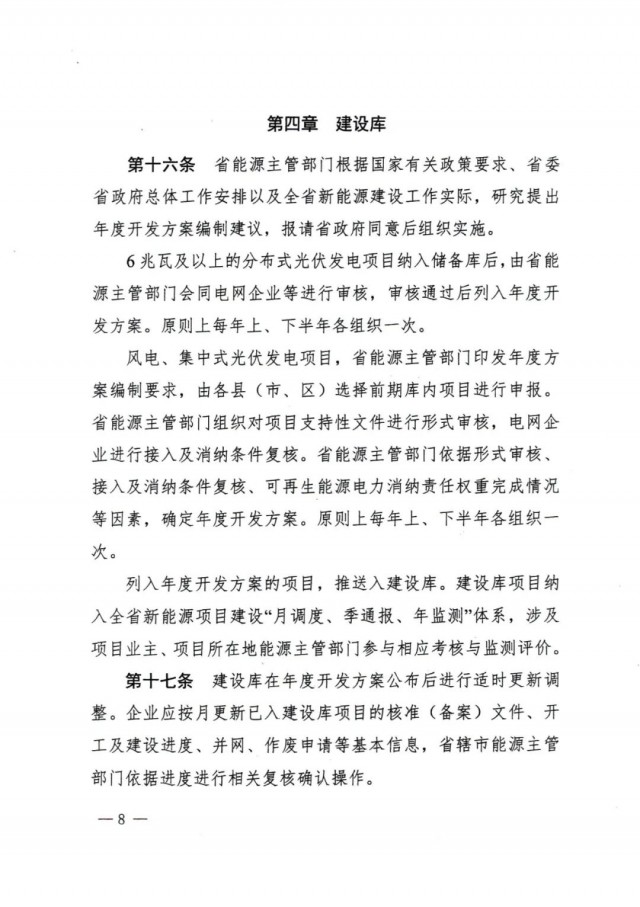 列入年度開(kāi)發(fā)方案的項(xiàng)目,推送入建設(shè)庫(kù)。建設(shè)庫(kù)項(xiàng)目納入全省新能源項(xiàng)目建設(shè)“月調(diào)度、季通報(bào)、年監(jiān)測(cè)”體系,涉及項(xiàng)目業(yè)主、項(xiàng)目所在地能源主管部門(mén)參與相應(yīng)考核與監(jiān)測(cè)評(píng)價(jià)。