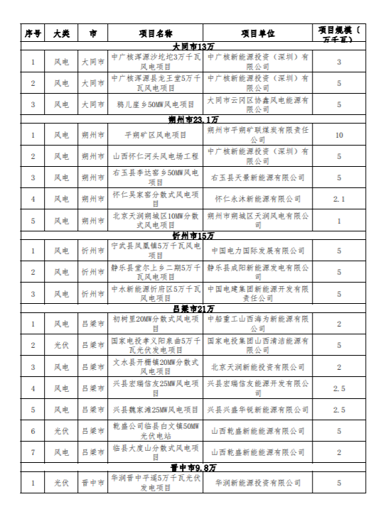 為推動全省新能源項目健康可持續(xù)發(fā)展,省能源局組織各市對2020年及之前長期占用資源、遲遲未能建成的風(fēng)電光伏發(fā)電項目進(jìn)行了梳理。相關(guān)地市上報了本地區(qū)擬廢止項目清單,經(jīng)我局匯總,擬將云崗區(qū)協(xié)鑫雅兒崖鄉(xiāng)等54個,總計規(guī)模138.8萬千瓦風(fēng)電光伏發(fā)電項目予以廢止,現(xiàn)予公示。相關(guān)企業(yè)如有異議,請向市能源局提出書面意見,并在公示期(5個工作日)內(nèi),由市能源局上報省能源局。