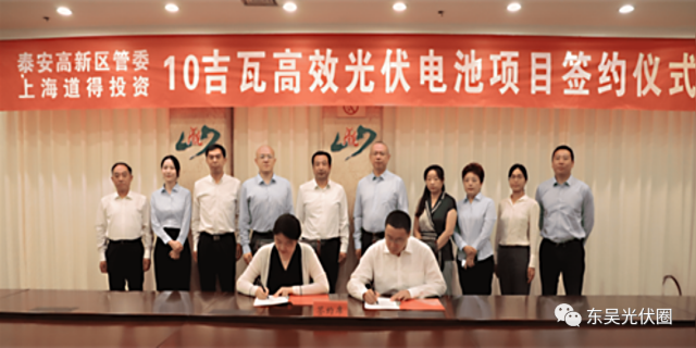 泰安高新區(qū)黨工委委員、高新發(fā)展集團黨委書記、董事長姚來新與道得投資風控總監(jiān)劉靜雯簽訂項目合作協(xié)議。據(jù)了解,該項目總投資40億元以上,將分為兩期建設,首期建設5吉瓦TOPCon電池生產(chǎn)線,二期建設5吉瓦TOPCon電池生產(chǎn)線。該項目旨在整合新能源產(chǎn)業(yè)鏈,助力實現(xiàn)雙碳戰(zhàn)略,預計年可實現(xiàn)產(chǎn)值120億元以上,5年內(nèi)累計繳稅15億元以上。
