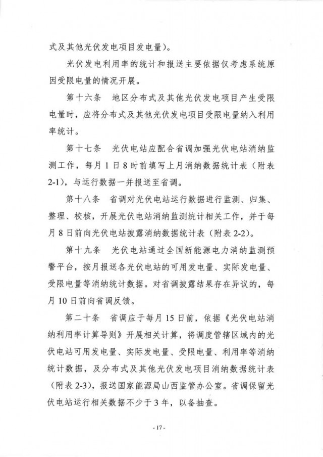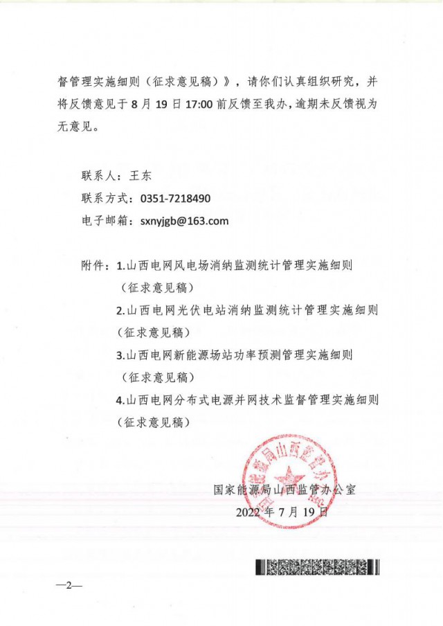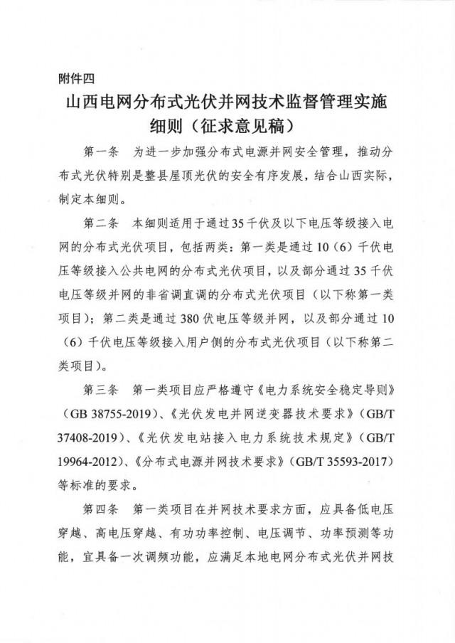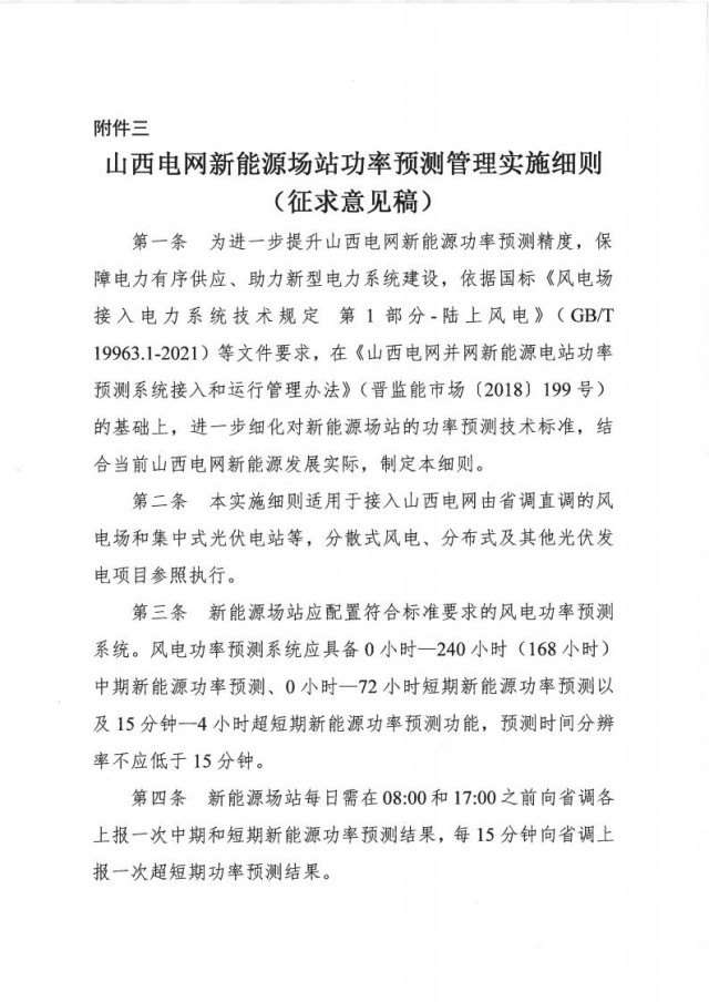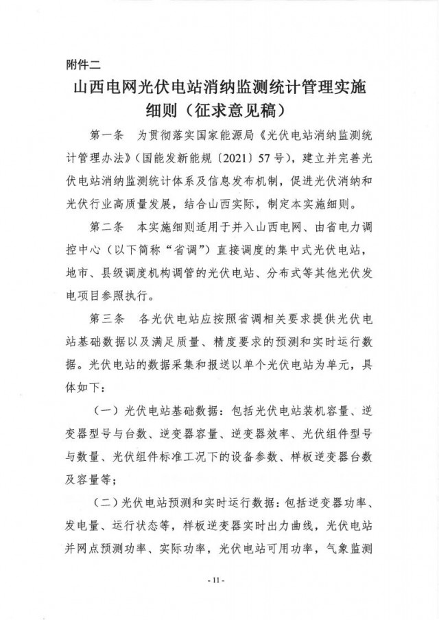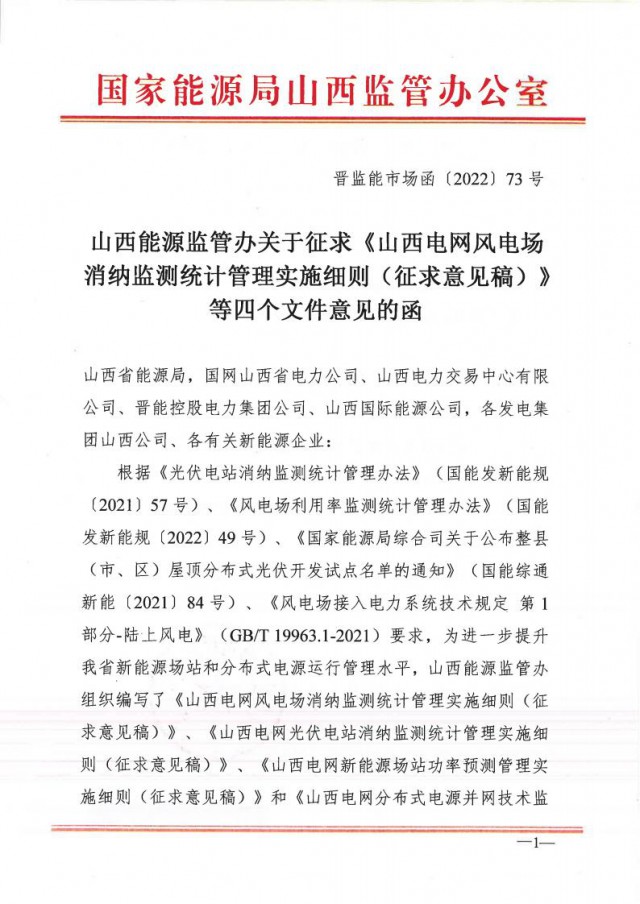 7月26日,山西能源監(jiān)管辦關(guān)于征求《山西電網(wǎng)風(fēng)電消納監(jiān)測統(tǒng)計(jì)管理實(shí)施細(xì)則(征求意見稿)》等四個(gè)文件意見的函,包含《山西電網(wǎng)光伏電站消納監(jiān)測統(tǒng)計(jì)管理實(shí)施細(xì)則(征求意見稿)》印發(fā),意見稿指出,本實(shí)施細(xì)則適用于并入山西電網(wǎng)、由省電力調(diào)控中心(以下簡稱“省調(diào)”)直接調(diào)度的集中式光伏電站,地市、縣級調(diào)度機(jī)構(gòu)調(diào)管的光伏電站、分布式等其他光伏發(fā)電項(xiàng)目參照執(zhí)行。