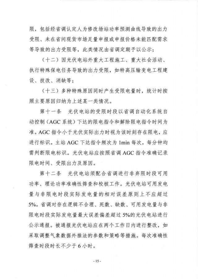 光伏電站可用發(fā)電量與非限電時(shí)段實(shí)際發(fā)電量的相對誤差原則上不應(yīng)超過5%。省調(diào)對存在邏輯不合理、死數(shù)、缺數(shù)、可用發(fā)電量與非限電時(shí)段實(shí)際發(fā)電量最大誤差偏差超過5%的光伏電站進(jìn)行公示通報(bào)。