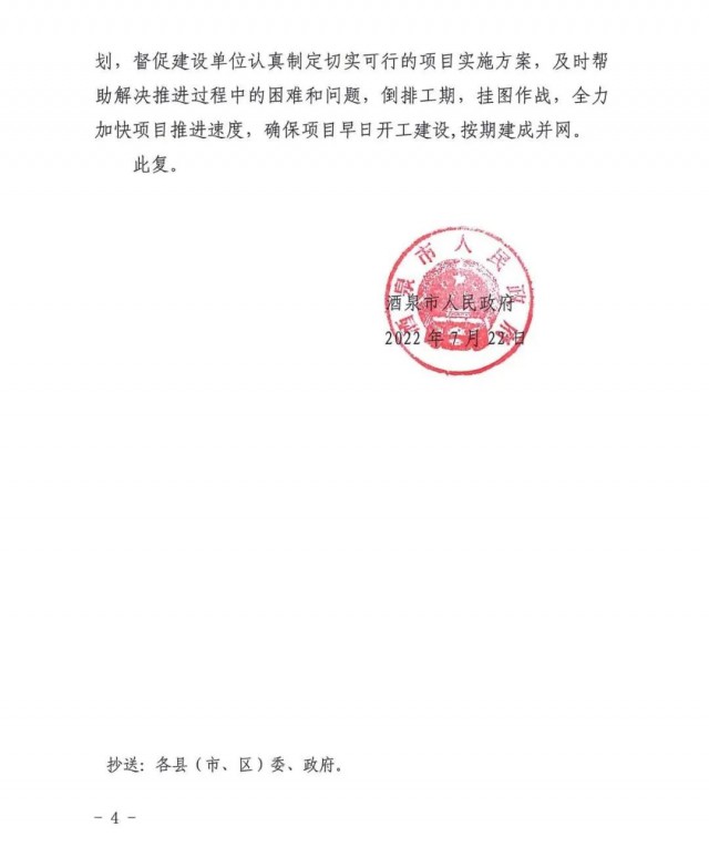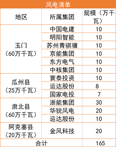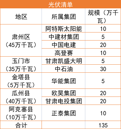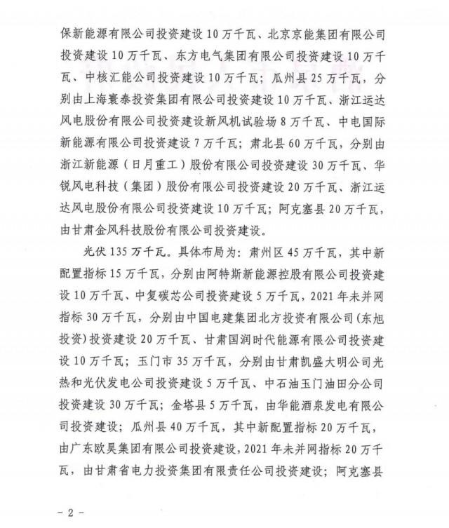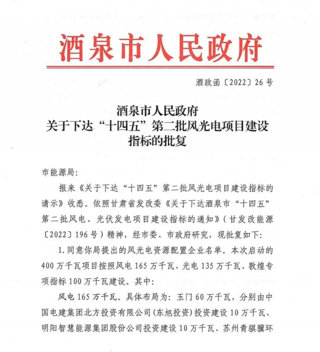 7月22日,甘肅酒泉市人民政府下發(fā)“十四五”第二批風(fēng)光項(xiàng)目建設(shè)指標(biāo)的批復(fù),按照風(fēng)電1.65GW、光伏1.35GW以及敦煌1GW專項(xiàng)指標(biāo)劃分,規(guī)??傆?jì)為4GW,光伏、風(fēng)電總規(guī)模各為2GW。