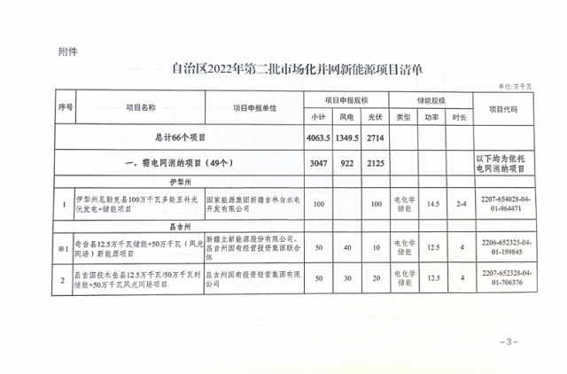 新疆2022年第二批市場化并網(wǎng)新能源項(xiàng)目清單,總計(jì)66個項(xiàng)目,規(guī)??傆?jì)為40.63GW,其中光伏為27.14GW,風(fēng)電為13.49GW。