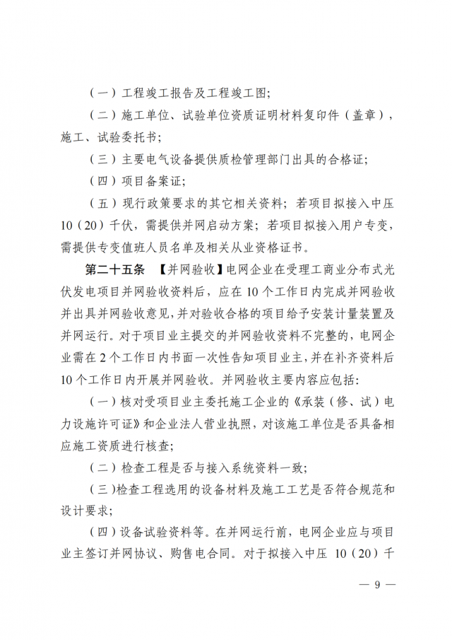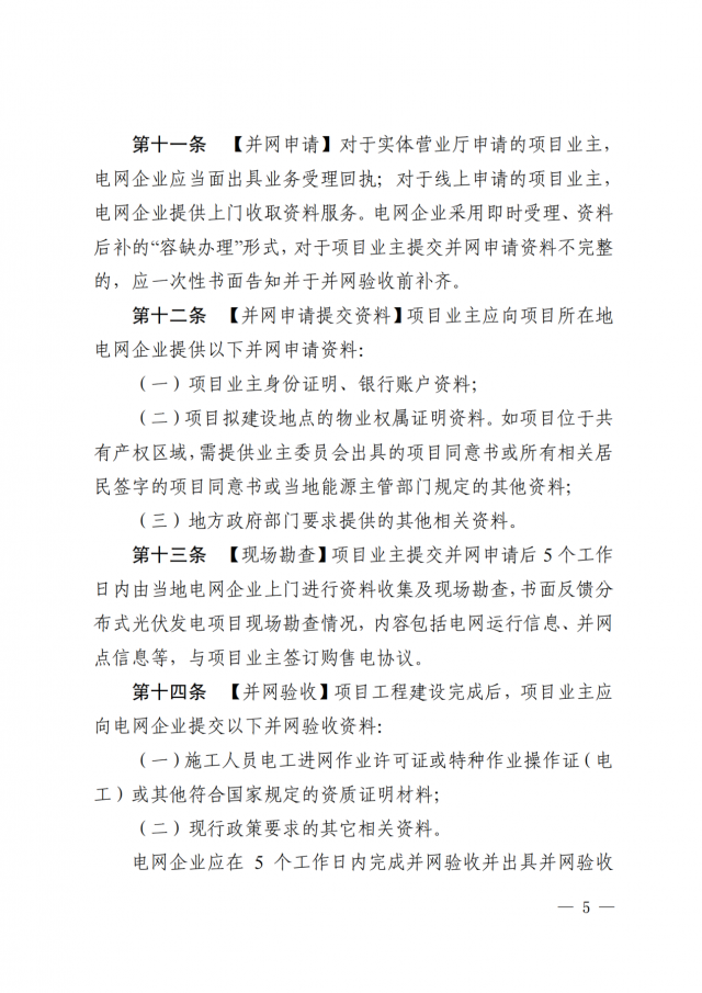2、現(xiàn)行政策要求的其它相關(guān)資料。電網(wǎng)企業(yè)應(yīng)在5個工作日內(nèi)完成并網(wǎng)驗收并出具并網(wǎng)驗收意見,并對驗收合格的項目給予安裝計量裝臵及并網(wǎng)運行。對于項目業(yè)主提交的并網(wǎng)驗收資料不完整的,電網(wǎng)企業(yè)應(yīng)在2個工作日內(nèi)書面一次性告知項目業(yè)主,并在補齊資料后5個工作日內(nèi)開展并網(wǎng)驗收。