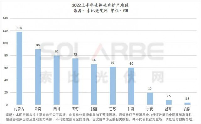 從擴(kuò)產(chǎn)地區(qū)來看,與硅料大同小異,硅棒硅片擴(kuò)產(chǎn)地區(qū)也較多集中于內(nèi)蒙古、云南、四川、新疆、青海等地。