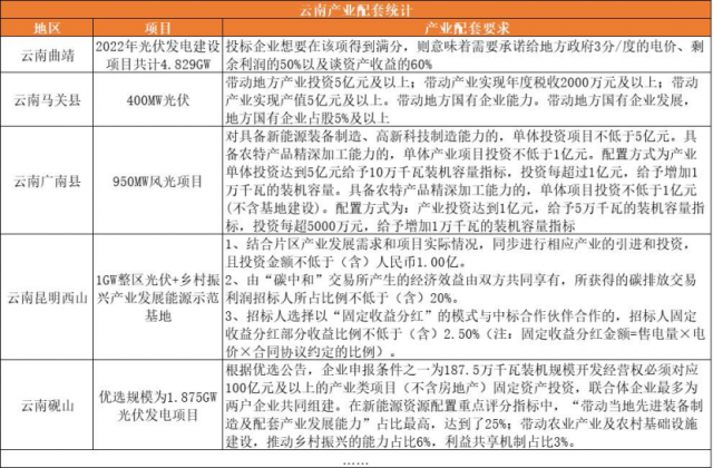近年來,新能源產(chǎn)業(yè)配套要求在云南并不少見,甚至已成常態(tài)。根據(jù)光伏們統(tǒng)計,云南曲靖、馬關(guān)縣、廣南縣、昆明西山、硯山等均發(fā)布過相關(guān)的項目產(chǎn)業(yè)配套要求。具體如下: