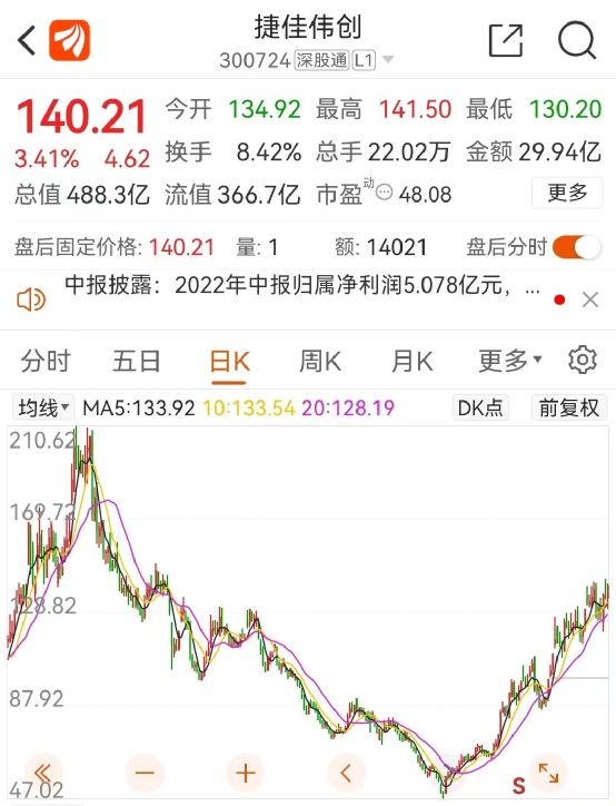 在公布減持計劃后,捷佳偉創(chuàng)股價在2021年8月23日達(dá)到歷史最高位210.62元/股。此后,股價便開啟回調(diào)模式。