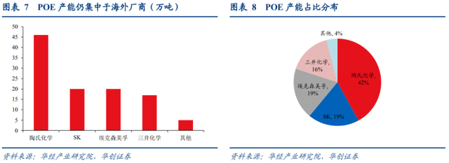 目前全球范圍內(nèi)POE產(chǎn)能十分集中,產(chǎn)能主要集中在陶氏、埃克森美孚、三井、SK等公司,其中陶氏產(chǎn)能46萬噸,占全球產(chǎn)能的42%;??松梨诤蚐K,產(chǎn)能均為20萬噸,占比均為19%,三井化學(xué)擁有17萬噸的產(chǎn)能,產(chǎn)能占比約16%。
