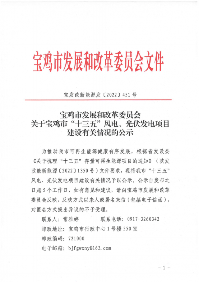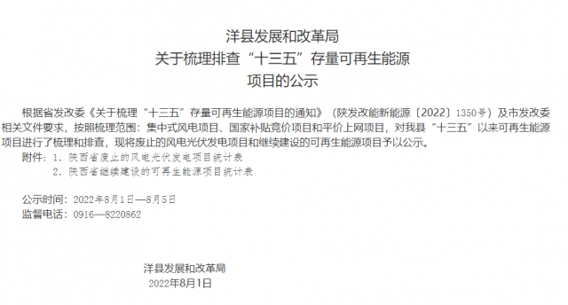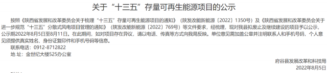 根據(jù)省發(fā)展改革委《關(guān)于梳理“十三五”存量可再生能源項(xiàng)目的通知》(陜發(fā)改能新能源〔2022〕1350號(hào))文件要求,現(xiàn)將我市擬上報(bào)省發(fā)改委“十三五”風(fēng)電、光伏發(fā)電項(xiàng)目建設(shè)有關(guān)情況予以公示。公示自發(fā)布之日起5個(gè)工作日,如有意見和建議,請(qǐng)向渭南市發(fā)展和改革委員會(huì)反映,反映方式以來(lái)人或署名來(lái)信(包括電子信函),對(duì)匿名方式提出異議的不予受理。