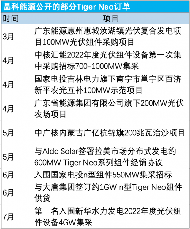 產(chǎn)能不斷攀升的同時(shí),晶科能源主推的n型Tiger Neo系列組件在市場(chǎng)上斬獲大量訂單,大大加速了TOPCon產(chǎn)業(yè)化進(jìn)程。晶科能源公開(kāi)的部分Tiger Neo訂單包括: