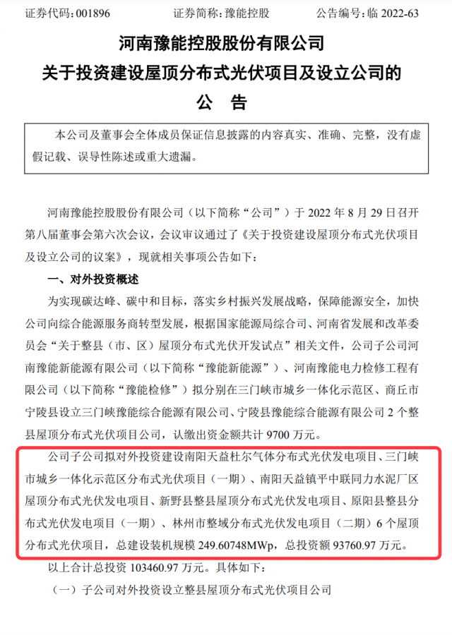 其中,豫能控股子公司豫能新能源、豫能檢修擬分別在三門峽市城鄉(xiāng)一體化示范區(qū)、商丘市寧陵縣設(shè)立三門峽豫能綜合能源有限公司、寧陵縣豫能綜合能源有限公司2個(gè)整縣屋頂分布式光伏項(xiàng)目公司,認(rèn)繳出資金額共計(jì)9700萬元。