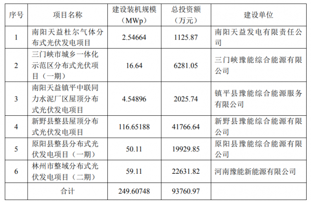 此外,豫能控股子公司擬對(duì)外投資建設(shè)南陽天益杜爾氣體分布式光伏發(fā)電項(xiàng)目、三門峽市城鄉(xiāng)一體化示范區(qū)分布式光伏項(xiàng)目(一期)、南陽天益鎮(zhèn)平中聯(lián)同力水泥廠區(qū)屋頂分布式光伏發(fā)電項(xiàng)目、新野縣整縣屋頂分布式光伏發(fā)電項(xiàng)目、原陽縣整縣分布式光伏發(fā)電項(xiàng)目(一期)、林州市整域分布式光伏發(fā)電項(xiàng)目(二期)6個(gè)屋頂分布式光伏項(xiàng)目。