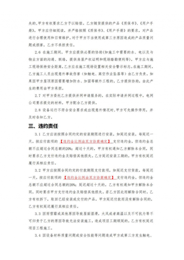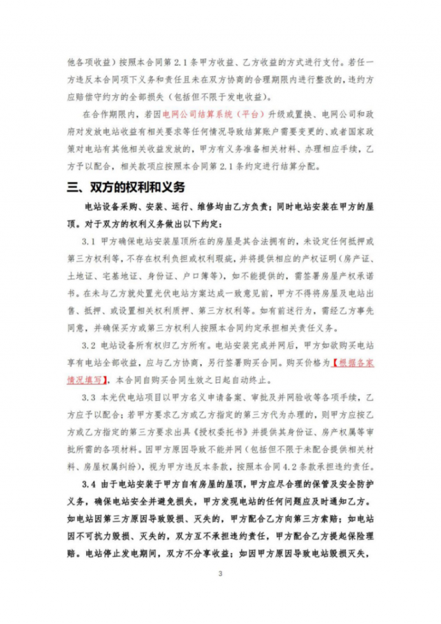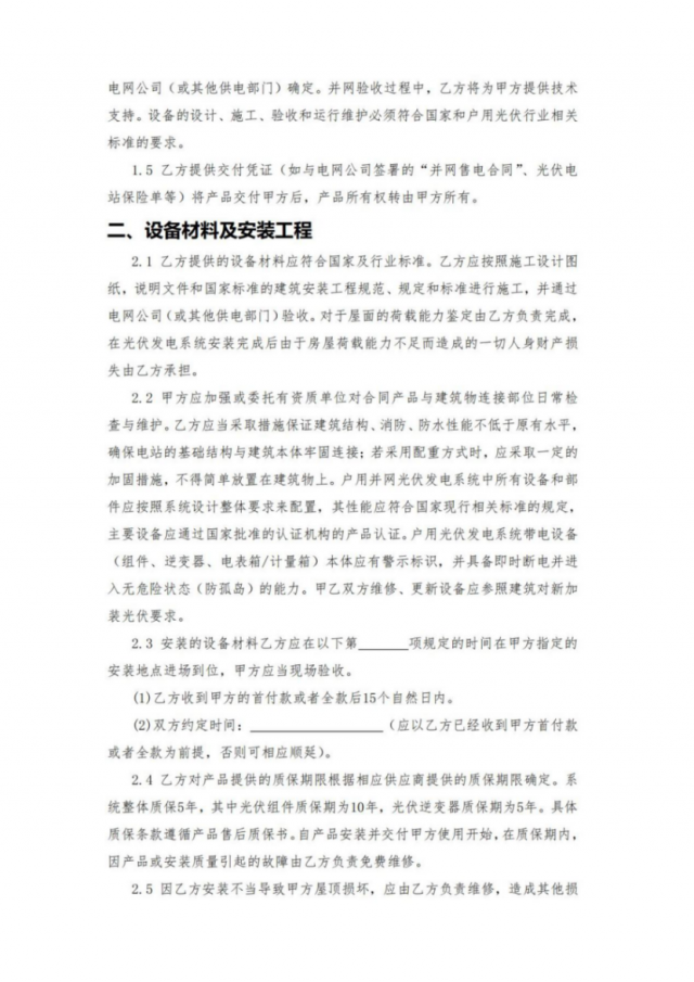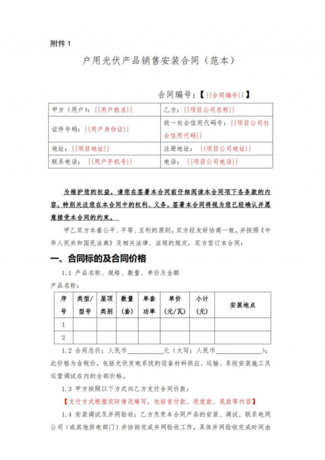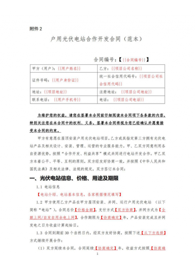 8月30日, 國家能源局轉(zhuǎn)發(fā)了此前中國光伏行業(yè)協(xié)會在充分征求各方面意見基礎上,編制發(fā)布的《戶用光伏產(chǎn)品銷售安裝合同(范本)》和《戶用光伏電站合作開發(fā)合同(范本)》,供居民用戶和光伏開發(fā)企業(yè)、戶用光伏經(jīng)銷商等各方參考。
