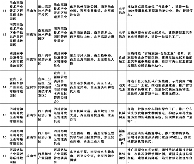 四川省近零碳排放園區(qū)試點擬確定名單(含試點園區(qū)名稱、所屬地區(qū)、所屬園區(qū)、申報主體、試點范圍、主導產業(yè)、試點特色),共17家園區(qū)。