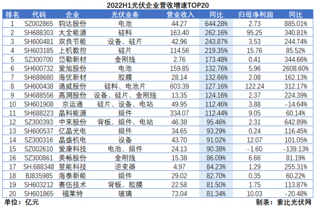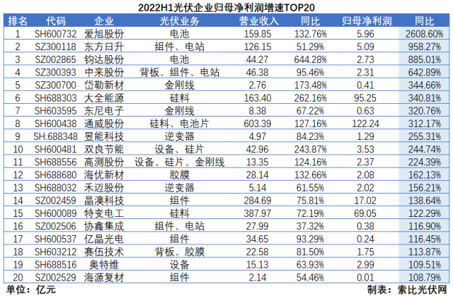 利潤增速方面,除了硅料企業(yè)延續(xù)高增長以外,去年因硅料價(jià)格暴漲而出現(xiàn)虧損的產(chǎn)業(yè)鏈中游專業(yè)化廠商,2022年上半年受益于供應(yīng)鏈管理能力的提升以及產(chǎn)品結(jié)構(gòu)的優(yōu)化,紛紛迎來困境翻轉(zhuǎn),其中愛旭股份、東方日升、中來股份的利潤增速分別達(dá)到2609%、958%和643%。此外,岱勒新材、東尼電子兩大金剛線廠商受益于硅片環(huán)節(jié)的擴(kuò)產(chǎn)以及細(xì)線化發(fā)展趨勢(shì),疊加自身的產(chǎn)能擴(kuò)張和成本下降,利潤增速均超300%。