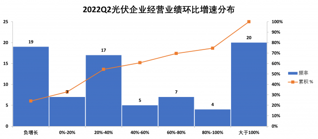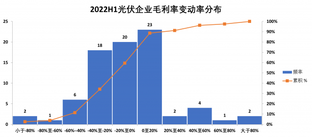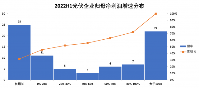 相比于營收的普漲態(tài)勢(shì),光伏企業(yè)的經(jīng)營業(yè)績卻出現(xiàn)顯著分化。2022年上半年,79家光伏企業(yè)的歸母凈利潤總額達(dá)到650億元,平均增速為32%。其中,利潤負(fù)增長的企業(yè)占比高達(dá)32%,而業(yè)績翻倍增長的企業(yè)占比亦達(dá)到28%,呈現(xiàn)顯著的“兩極分化”態(tài)勢(shì)。不過,與2021年不同的是,產(chǎn)業(yè)鏈中游的諸多專業(yè)化廠商紛紛迎來“困境反轉(zhuǎn)”,而業(yè)績出現(xiàn)下滑的企業(yè)多為競(jìng)爭(zhēng)力一般的中小市值企業(yè)。