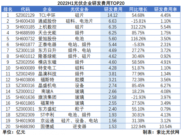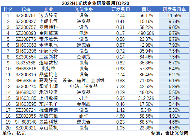 當(dāng)然,N型電池技術(shù)之所以能夠不斷取得突破性進(jìn)展,離不開生產(chǎn)設(shè)備的持續(xù)升級(jí)與迭代。在研發(fā)費(fèi)用率排名中,前20位中有10家是設(shè)備廠商,其中HJT設(shè)備龍頭邁為股份的研發(fā)費(fèi)用率更是高達(dá)11.59%。在近期的中報(bào)業(yè)績交流會(huì)中,邁為股份表示預(yù)計(jì)今年下半年HJT組件成本能夠與PERC組件持平,至2023年HJT電池片成本優(yōu)勢(shì)將會(huì)逐步顯現(xiàn)。