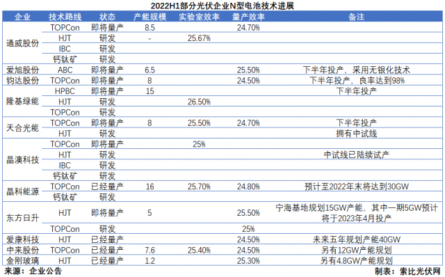 除了盈利能力以及經(jīng)營業(yè)績顯著改善以外,電池片環(huán)節(jié)的N型電池技術(shù)變革也成為了時(shí)下業(yè)界以及資本市場(chǎng)關(guān)注的焦點(diǎn)。2022年上半年,TOPCon、HJT乃至鈣鈦礦等電池片概念成為A股市場(chǎng)炒作的熱點(diǎn),期間更是誕生了寶馨科技、京山輕機(jī)、金剛玻璃等一眾“妖股”。而在中報(bào)中,各大龍頭企業(yè)也重點(diǎn)披露了N型電池技術(shù)的進(jìn)展情況。