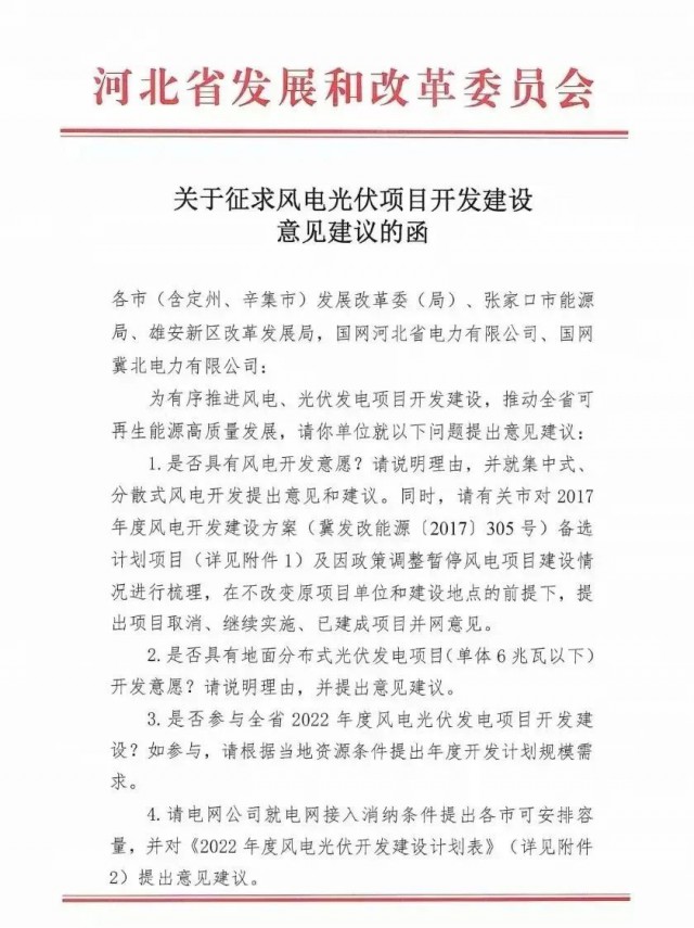 在征求意見函中,河北省發(fā)改委要求各地主管部門就風(fēng)電、地面分布式光伏開發(fā)意愿進行說明,并請電網(wǎng)公司就電網(wǎng)接入消納條件提出各市可安排容量,并對《2022年度風(fēng)電光伏開發(fā)建設(shè)計劃表》提出意見建議。