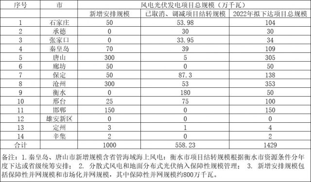 根據(jù)公示的2022年風(fēng)光開發(fā)建設(shè)規(guī)模表,河北省2022年擬下達風(fēng)光項目14.29GW,分布在石家莊、承德、張家口、秦皇島等14個市。其中,已取消、調(diào)減項目結(jié)轉(zhuǎn)規(guī)模5.58GW,新增規(guī)模規(guī)模為10GW。