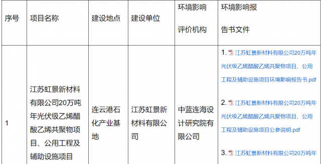 9月16日,江蘇虹景新材料有限公司(以下簡稱” 虹景公司”)20萬噸年光伏級乙烯醋酸乙烯共聚物項目、公用工程及輔助設施項目進行環(huán)評報告書受理公示。根據(jù)企查查顯示,虹景公司為東方盛虹旗下斯爾邦石化全資控股子公司。