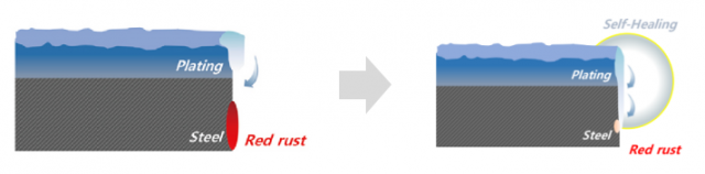 革新后的鍍鎂鋁鋅板與相同鍍鋅附著量的普通熔融鍍鋅鋼板(GI, GI(H))相比具有10倍以上耐蝕性的產(chǎn)品,與現(xiàn)有市面上普遍使用的鍍鋅材料產(chǎn)品相比,在平板部位表現(xiàn)出2倍的優(yōu)異耐蝕性。