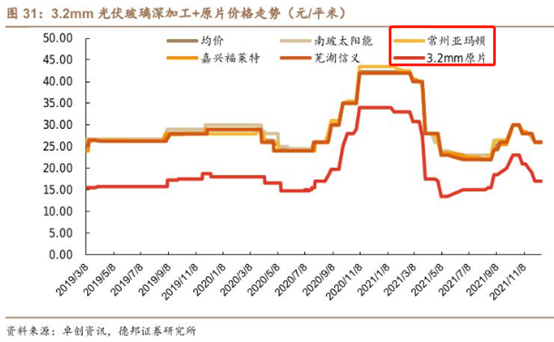 以3.2mm光伏玻璃為例。過去幾年,剔除異常波動(dòng)年份,加工后的光伏玻璃價(jià)格基本在25元/平米左右,原片價(jià)格約為15元/平米。價(jià)差10元/平米。
