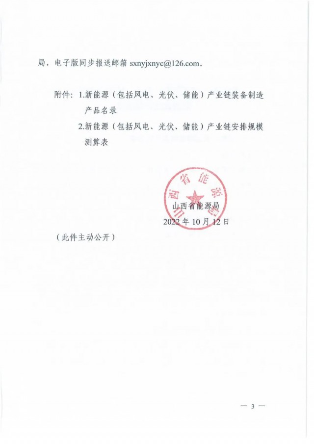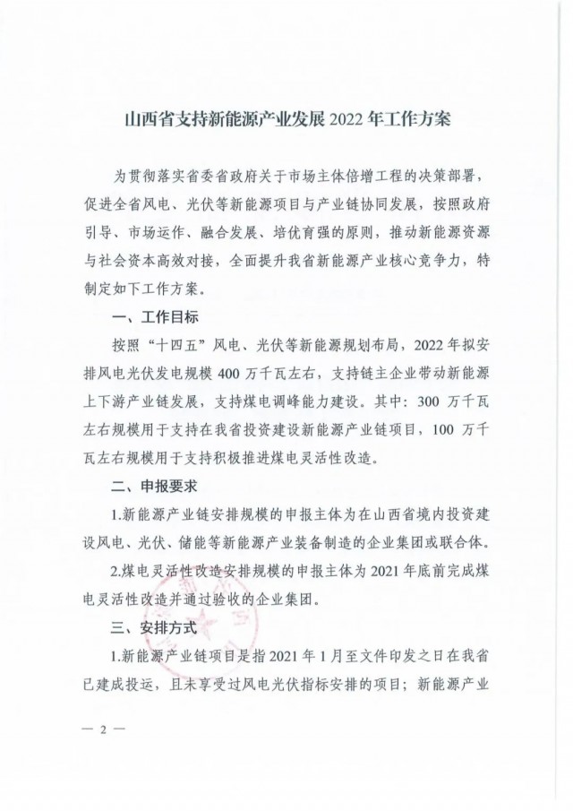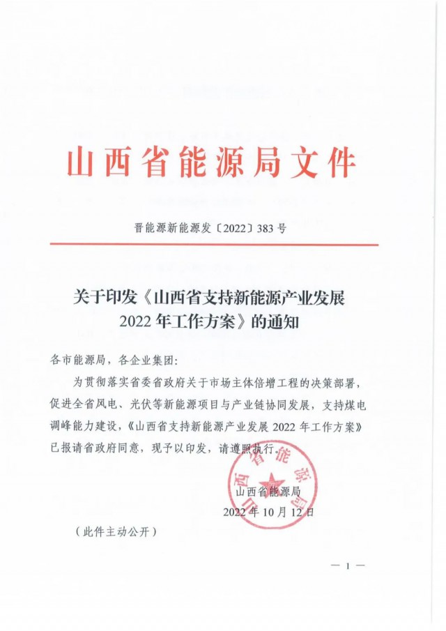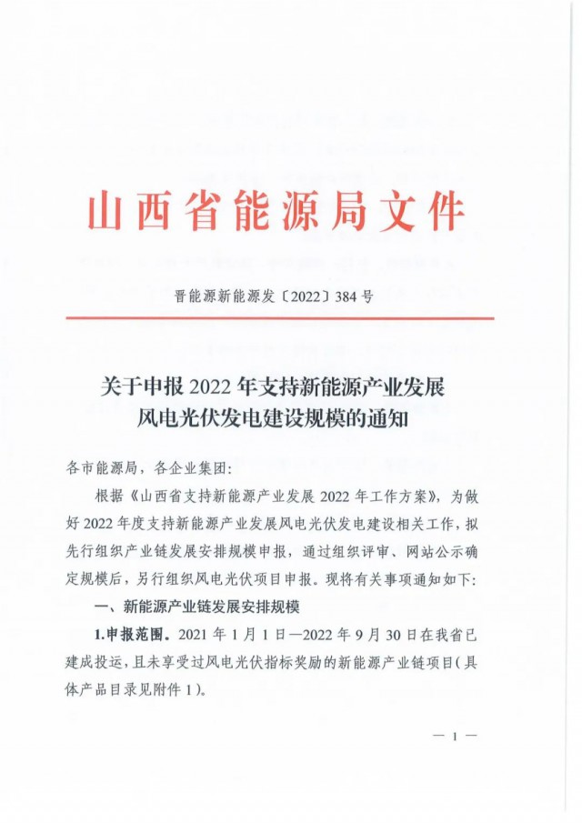 10月12日,山西省能源局印發(fā)《山西省支持新能源產(chǎn)業(yè)發(fā)展2022年工作方案》、《關(guān)于申報2022年支持新能源產(chǎn)業(yè)發(fā)展風(fēng)電光伏發(fā)電建設(shè)規(guī)模》的通知,擬先行組織產(chǎn)業(yè)鏈發(fā)展安排規(guī)模申報3GW以及1GW煤電靈活性調(diào)峰改造配套風(fēng)光項目。