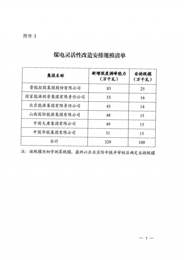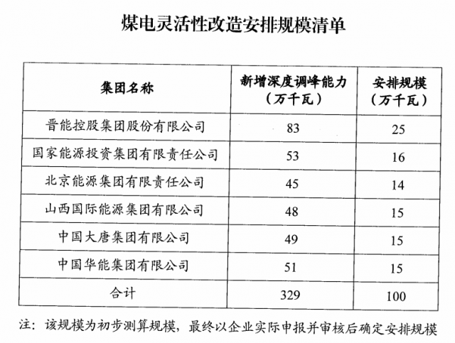 煤電靈活性改造調(diào)峰配套新能源項目的申報范圍則是2021年底前完成改造的煤電機組,安排規(guī)模則是按照新增深度調(diào)峰能力的30%確定。初步測算確定晉能、國家能源集團、京能、山西國際能源、大唐、華能6家企業(yè)獲得1GW煤電改造配套項目,具體仍需以企業(yè)實際申報規(guī)模為準(zhǔn)。