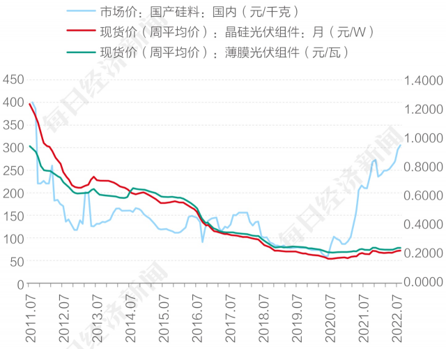 2011年7月開始下行以來,至2022年7月國產(chǎn)硅料價格走出一條V形線,11年過去,還未達到當(dāng)時的價格水平 圖片來源:每經(jīng)記者 劉國梅 制圖