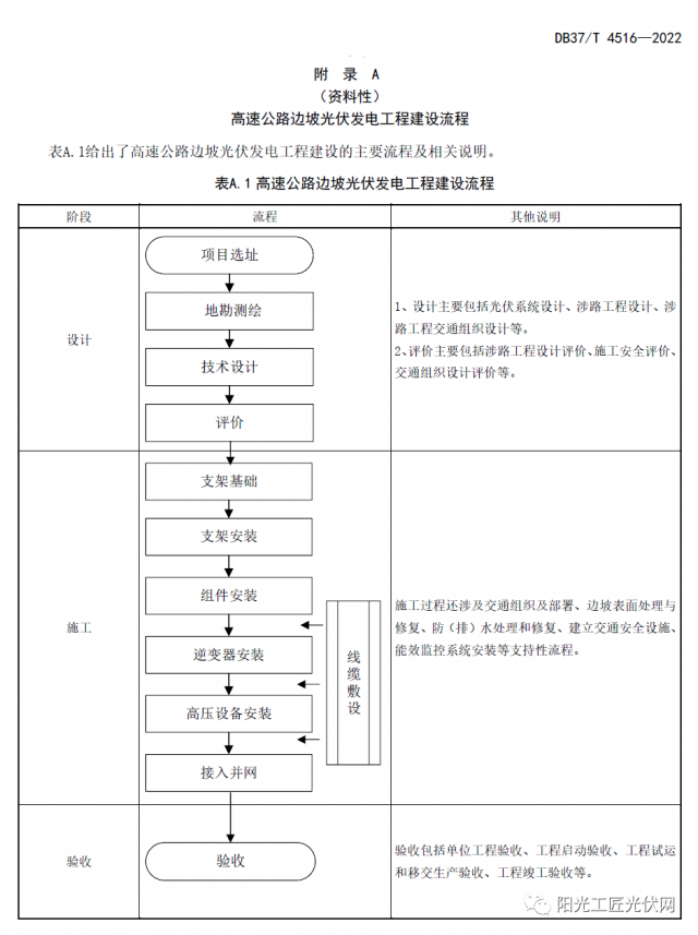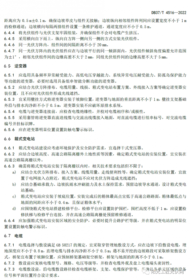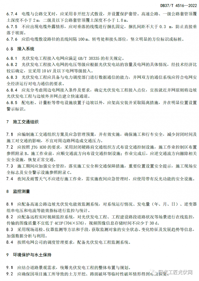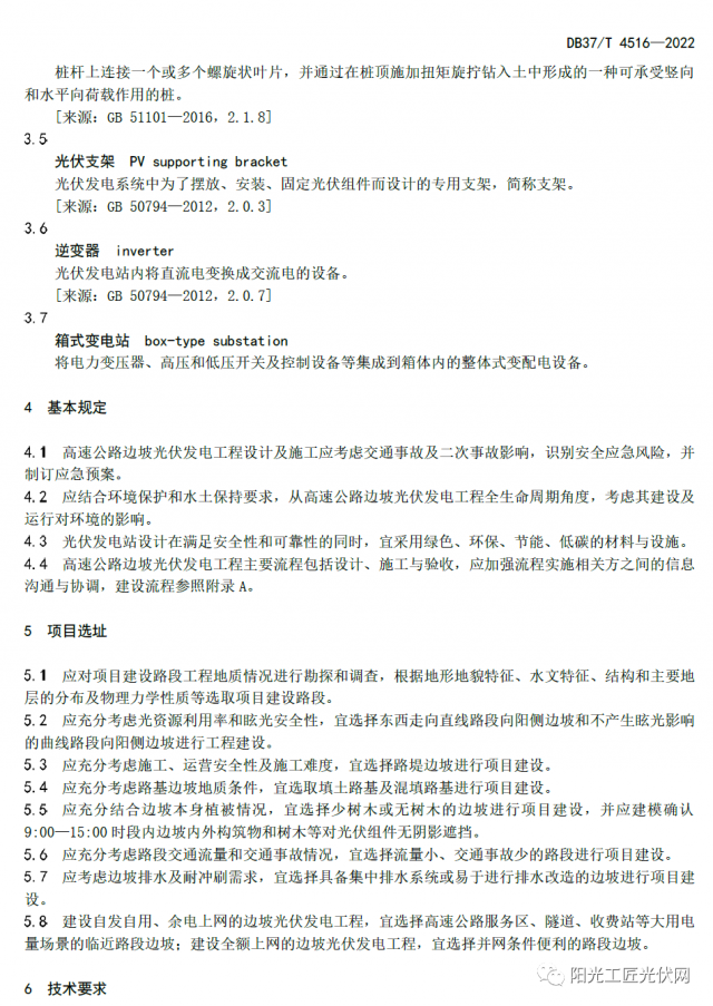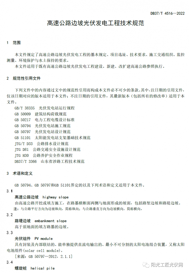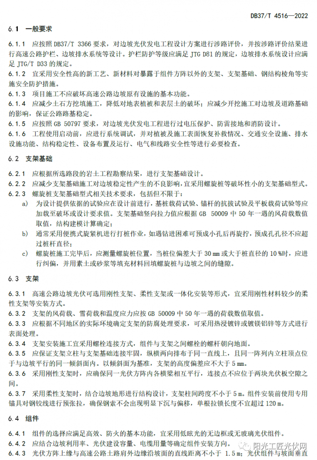 本標準綜合考慮了高速公路行車對邊坡光伏的技術要求,具有安全、環(huán)保、美觀、經濟的技術特點。在安全性上,精心選用了低反光無眩光、防火防水防腐、不易碎、具有自清潔功能的輕質柔性光伏組件和帶有自動關斷功能的逆變器,采用柔性支架安裝,組件棱角使用柔性材料包裹,避免影響駕駛安全和二次事故傷害。在環(huán)保性上,設計了螺旋樁打孔施工技術,減少對邊坡草皮的破壞。在美觀性上,注重光伏組件陣列與邊坡斜面外觀上的統一融合,視覺效果美觀、舒適。在經濟性上,最大限度提高邊坡資源利用率,有利于規(guī)模化開發(fā)。