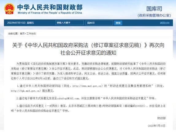 ?圖:財(cái)政部國(guó)庫(kù)司發(fā)布關(guān)于《中華人民共和國(guó)政府采購(gòu)法(修訂草案征求意見(jiàn)稿)》