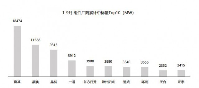 ?圖:據(jù)公開(kāi)數(shù)據(jù)統(tǒng)計(jì),2022年1-9月組件廠(chǎng)商累計(jì)中標(biāo)量(MW)