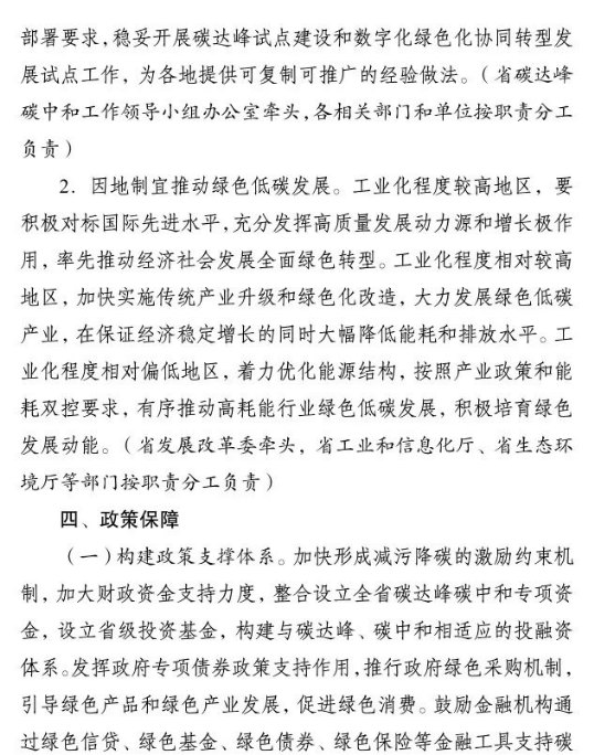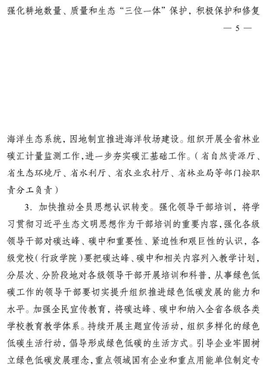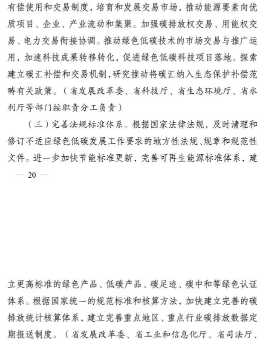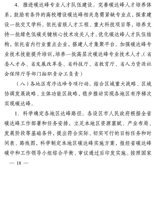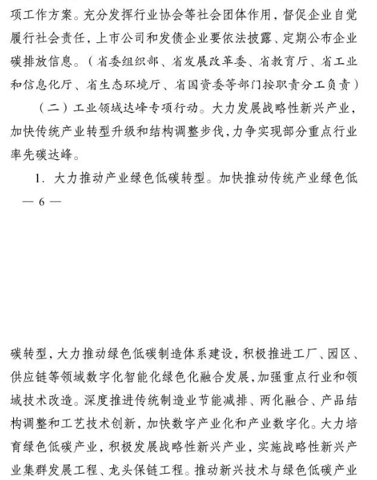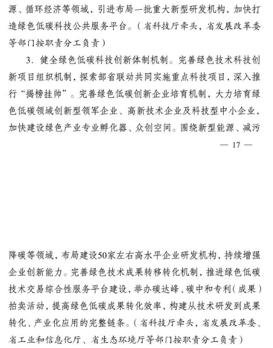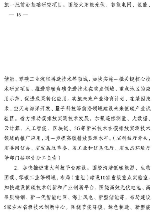 加快推進(jìn)重大科技平臺建設(shè)。圍繞清潔低碳能源、生物固碳、零碳工業(yè)等領(lǐng)域,布局(重組)建設(shè)10家省級重點實驗室。加快建設(shè)低碳技術(shù)創(chuàng)新和產(chǎn)業(yè)創(chuàng)新平臺,圍繞高效光伏電池、高品質(zhì)特鋼、新一代智能電網(wǎng)、海上風(fēng)電、新型儲能等,布局建設(shè)5家左右省級技術(shù)創(chuàng)新中心。圍繞節(jié)能降碳、綠色制造、新型能源、循環(huán)經(jīng)濟(jì)等領(lǐng)域,引進(jìn)布局一批重大新型研發(fā)機(jī)構(gòu),加快打造綠色低碳科技公共服務(wù)平臺。