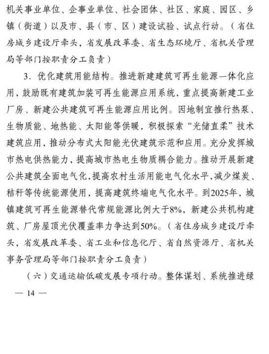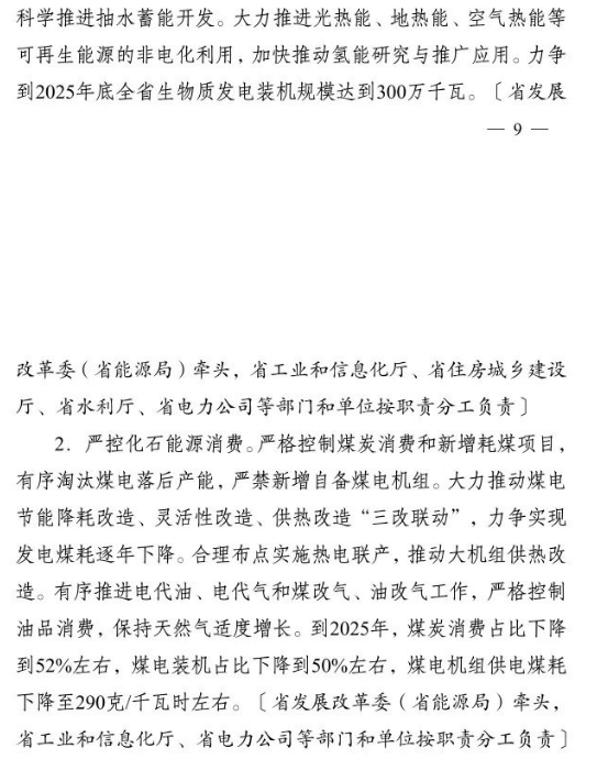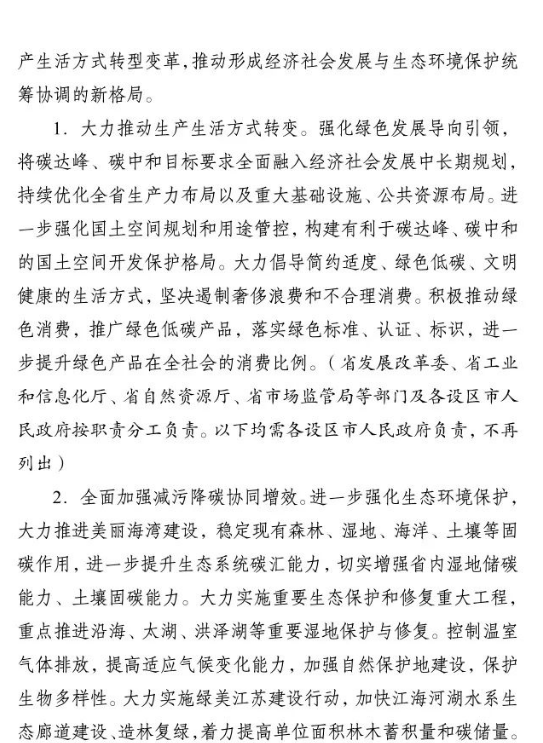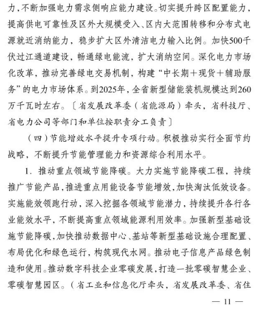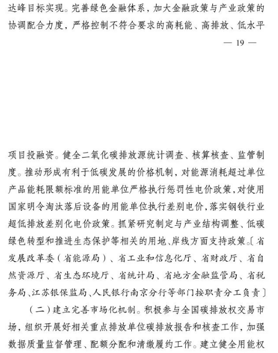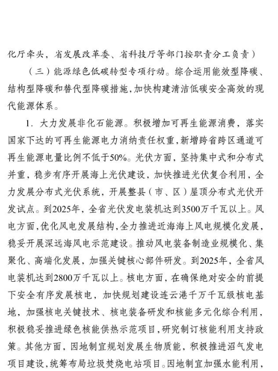 10月2日,江蘇省人民政府印發(fā)《江蘇省碳達(dá)峰實施方案》。文件提出,大力發(fā)展非化石能源。積極增加可再生能源消費,落實國家下達(dá)的可再生能源電力消納責(zé)任權(quán)重,新增跨省跨區(qū)通道可再生能源電量比例不低于50%.光伏方面,堅持集中式和分布式并重,穩(wěn)步有序開展海上光伏建設(shè),加快推進(jìn)光伏復(fù)合利用,全力發(fā)展分布式光伏系統(tǒng),開展整縣(市、區(qū))屋頂分布式光伏開發(fā)試點。到2025年,全省光伏發(fā)電裝機(jī)達(dá)到3500萬千瓦以上。風(fēng)電方面,優(yōu)化風(fēng)電發(fā)展結(jié)構(gòu),全力推進(jìn)近海海上風(fēng)電規(guī)?;l(fā)展,穩(wěn)妥開展深遠(yuǎn)海風(fēng)電示范建設(shè)。推動風(fēng)電裝備制造業(yè)規(guī)?;?、集聚化、高端化發(fā)展,加強(qiáng)關(guān)鍵核心部件研發(fā)。到2025年,全省風(fēng)電裝機(jī)達(dá)到2800萬千瓦以上。核電方面,在確保絕對安全的前提下安全有序發(fā)展核電,加快規(guī)劃建設(shè)連云港千萬千瓦級核電基地,加強(qiáng)核電關(guān)鍵技術(shù)、核電裝備研發(fā)和核能多元化綜合利用,積極穩(wěn)妥推進(jìn)綠色核能供熱示范項目,研究制訂核能利用支持政策。其他方面,因地制宜規(guī)劃發(fā)展生物質(zhì)能,積極推進(jìn)沼氣發(fā)電項目建設(shè),統(tǒng)籌布局垃圾焚燒電站項目。因地制宜加強(qiáng)水能利用,科學(xué)推進(jìn)抽水蓄能開發(fā)。大力推進(jìn)光熱能、地?zé)崮堋⒖諝鉄崮艿瓤稍偕茉吹姆请娀?,加快推動氫能研究與推廣應(yīng)用。力爭到2025年底全省生物質(zhì)發(fā)電裝機(jī)規(guī)模達(dá)到300萬千瓦。