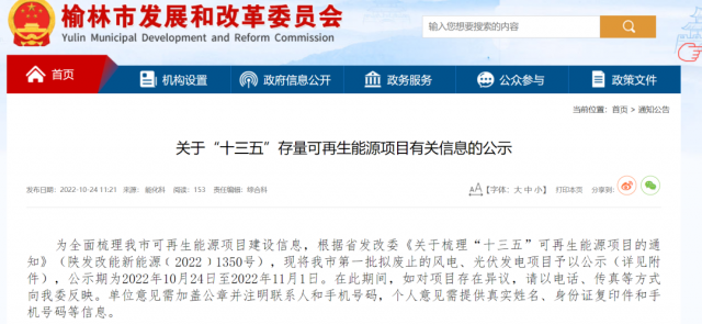 為全面梳理我市可再生能源項目建設(shè)信息,根據(jù)省發(fā)改委《關(guān)于梳理“十三五”可再生能源項目的通知》(陜發(fā)改能新能源﹝2022﹞1350號),現(xiàn)將我市第一批擬廢止的風(fēng)電、光伏發(fā)電項目予以公示(詳見附件),公示期為2022年10月24日至2022年11月1日。在此期間,如對項目存在異議,請以電話、傳真等方式向我委反映。單位意見需加蓋公章并注明聯(lián)系人和手機號碼,個人意見需提供真實姓名、身份證復(fù)印件和手機號碼等信息。
