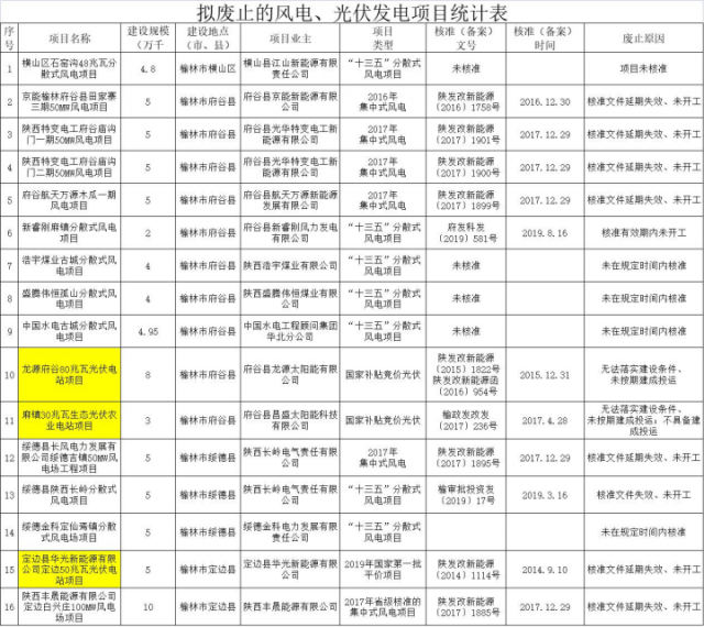 龍源府谷80兆瓦光伏電站項目廢止原因為:無法落實建設(shè)條件、未按期建成投運;麻鎮(zhèn)30兆瓦生態(tài)光伏農(nóng)業(yè)電站項目廢止原因為無法落實建設(shè)條件、未按期建成投運;不具備建成投運;定邊縣華光新能源有限公司定邊50兆瓦光伏電站項目廢止原因:核準(zhǔn)文件延期失效、未開工。