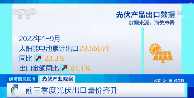 光伏產(chǎn)品的出口表現(xiàn)也超出預(yù)期,海關(guān)數(shù)據(jù)顯示,今年前9個(gè)月,太陽能電池累計(jì)出口29.55億個(gè),同比增長23.3%,出口金額同比增加84.1%,實(shí)現(xiàn)量價(jià)齊升。