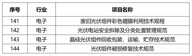 在公布的《2022年度工業(yè)節(jié)能與綠色標準研究項目清單》中,共包括鋼鐵、有色金屬、石化化工、建材、機械、汽車、輕工、紡織、電子、包裝、通信、船舶及綜合13個大類157項規(guī)范項目,其中在電子行業(yè),光伏電站的拆除、廢棄光伏組件的運輸、包裝、貯存及修復等技術規(guī)范被納入其中,分別為《廢舊光伏組件彩色鍍膜利用技術規(guī)程》、《光伏電站安全拆除及分類處置管理規(guī)范》、《晶硅光伏組件回收包裝、運輸、貯存技術規(guī)范》及《光伏組件破損修復技術規(guī)范》4項規(guī)范。