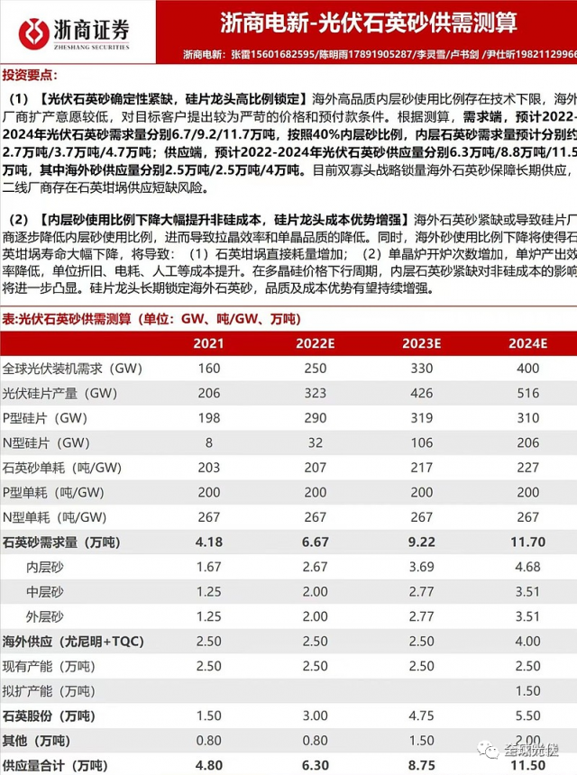 ②據行業(yè)專家,100GW硅片對應2-3萬噸石英砂,內中外層的用量占比為4:3:3。據CPIA,2023年全球新增光伏裝機248GW。假設全產業(yè)鏈后道環(huán)節(jié)零損耗,零庫存,則對應石英砂的最小用量為6.20萬噸,對應內中、外層砂用量4.34萬噸/1.86萬噸。