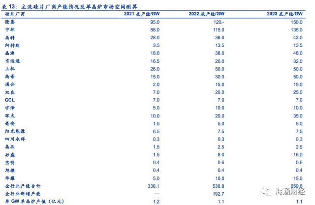①假設1:硅片大型化下,2023年182硅片為主流。據石英石網,生產1GW182硅片需配備100臺單晶爐;