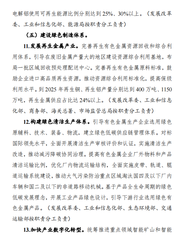 提高可再生能源使用比例,鼓勵企業(yè)在資源環(huán)境可承載的前提下向可再生能源富集地區(qū)有序轉(zhuǎn)移,逐步減少使用火電的電解鋁產(chǎn)能。利用電解鋁、工業(yè)硅等有色金屬生產(chǎn)用電量大、負(fù)荷穩(wěn)定等特點,支持企業(yè)參與以消納可再生能源為主的微電網(wǎng)建設(shè),支持具備條件的園區(qū)開展新能源電力專線供電,提高消納能力。鼓勵和引導(dǎo)有色金屬企業(yè)通過綠色電力交易、購買綠色電力證書等方式積極消納可再生能源,確保可再生能源電力消納責(zé)任權(quán)重高于本區(qū)域最低消納責(zé)任權(quán)重。力爭2025年、2030年電解鋁使用可再生能源比例分別達(dá)到25%、30%以上。
