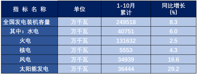 截至今年10月底,全國累計(jì)發(fā)電裝機(jī)容量約24.952億千瓦。其中,光電3.644億千瓦,風(fēng)電3.494億千瓦,水電4.075億千瓦,核電0.555億千瓦,火電13.163。