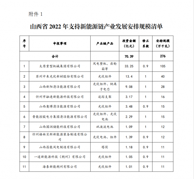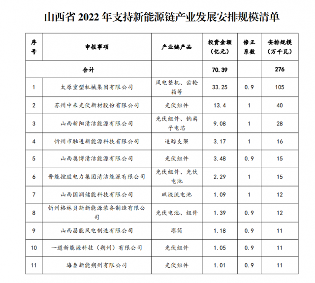 12月6日,山西省能源局公布《2022年支持新能源產(chǎn)業(yè)發(fā)展風電光伏發(fā)電建設(shè)規(guī)模評審結(jié)果》,規(guī)模共計3.72GW,其中新能源產(chǎn)業(yè)鏈企業(yè)11個家,總投資額達70.39億元,安排規(guī)模2.76GW;煤電調(diào)峰能力建設(shè)企業(yè)6家,安排0.96GW。