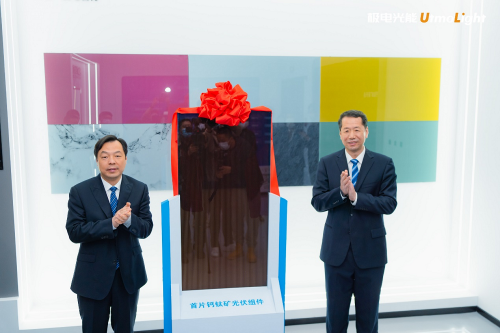 方書(shū)記一行還參觀了極電光能鈣鈦礦科技展廳和150MW鈣鈦礦生產(chǎn)線,現(xiàn)場(chǎng)為首片下線的鈣鈦礦光伏組件揭幕。